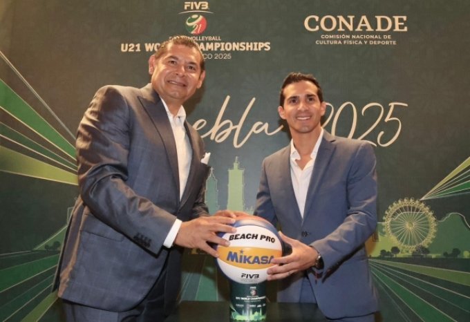 El director general de la Comisión Nacional de Cultura Física y Deporte (CONADE), Rommel Pacheco Marrufo, y el gobernador de Estado de Puebla, Alejandro Armenta, presentaron oficialmente este miércoles el Campeonato Mundial Sub-21 de Voleibol de Playa 2025, prestigioso evento a celebrarse del 15 al 19 de octubre en dicha entidad.